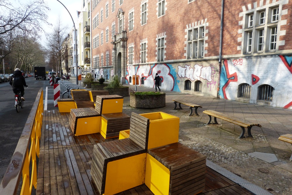 Die Idee dahinter ist, den engen Schulhof zu entlasten, da wegen des Neubaus der Lina-Morgenstern-Gemeinschaftsschule an der Nostitzstraße hier vorübergehend zusätzliche Klassen untergebracht sind. Bürgermeisterin Monika Herrmann freut sich über „ein wunderbares Beispiel dafür, wie die Straßenmöbel temporär eingesetzt und öffentliche Räume gerechter verteilt werden können“, so die Pressemitteilung des Bezirks. Vielleicht bauen auf den Parklets ja auch wieder „Unbekannte“ Cannabis an, wie im Sommer 2019.