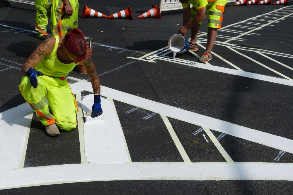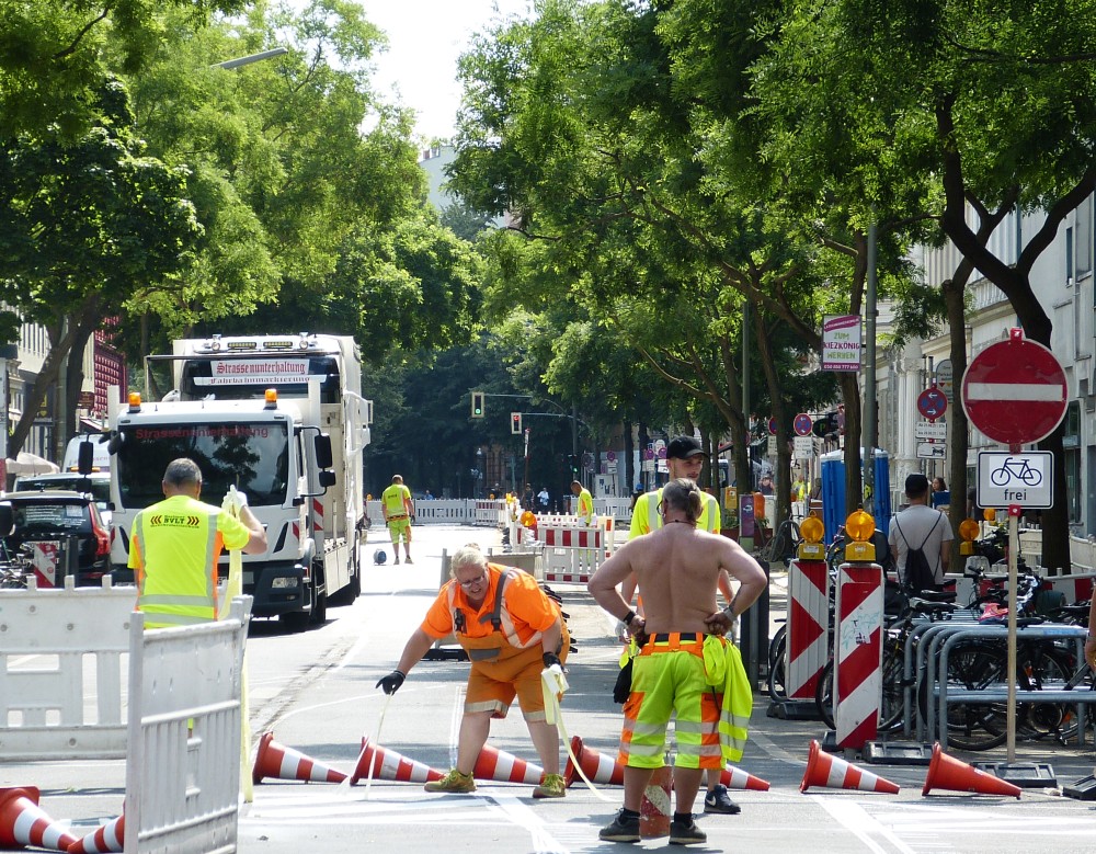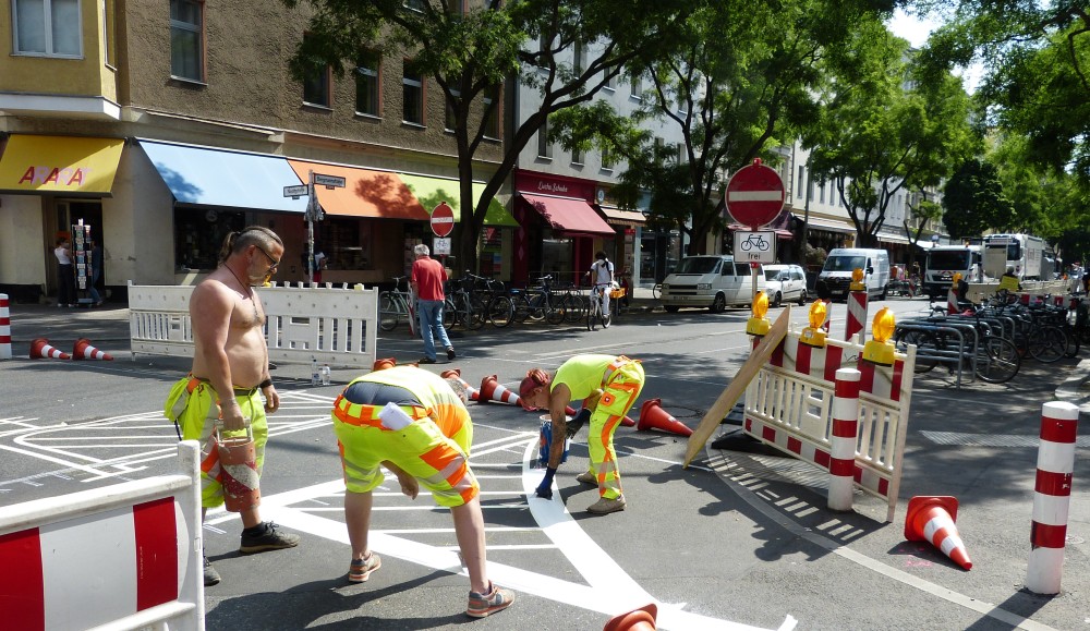 Es gibt viel zu tun, um zumindest in der Bergmannstraße die Termine halbwegs zu halten. Fahrbahnmarkierungen sind in so einer Straße immer noch größtenteils Handarbeit, weshalb die Markierungsfirma auch am Samstag mit mächtig Personaleinsatz in der prallen Sonne aktiv ist. Um sie herum wuselt der Verkehr, der aber nur noch aus wenigen Autos besteht.