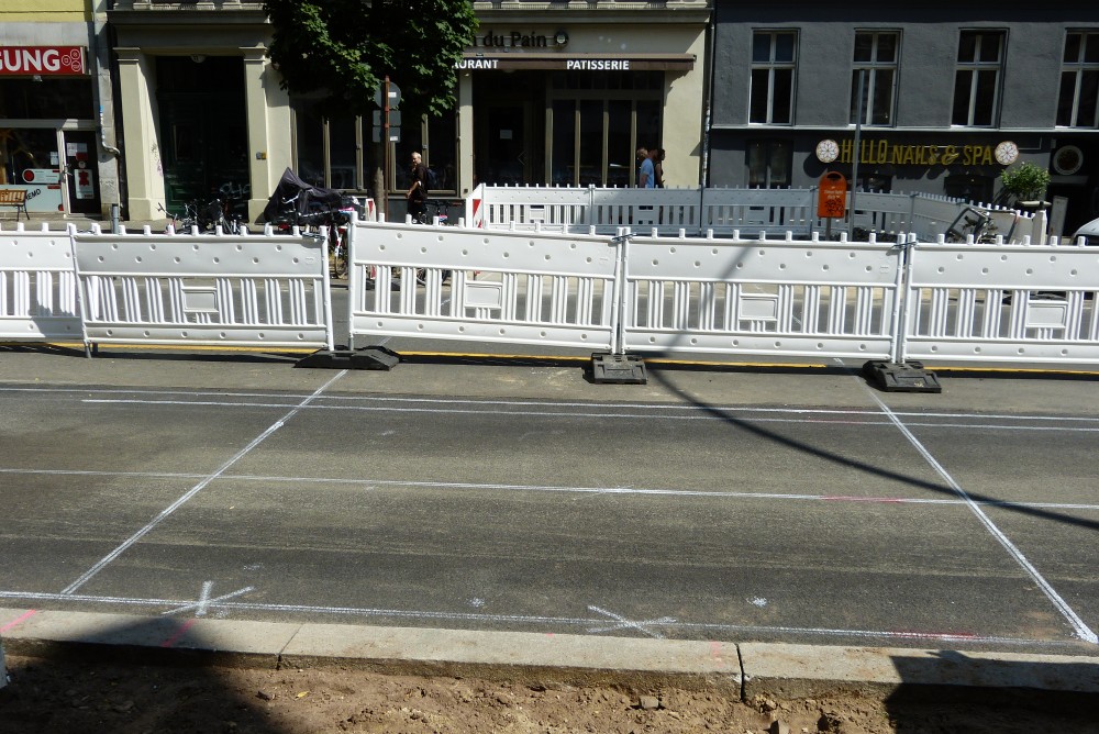 Was wie Tramschienen aussieht, ist die vorbereitende Risszeichnung für die hier noch fehlende Fahrbahnmarkierung.