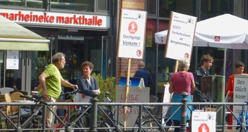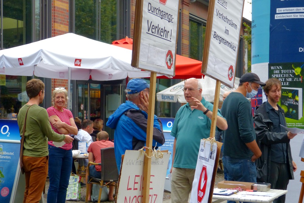 Die Initiatve Leiser Bergmannkiez hatte diesen Samstag einen Infostand vor der Markthalle. Als die Sonne rauskam ging es los. Eine gute Gelegenheit, sich kennenzulernen.